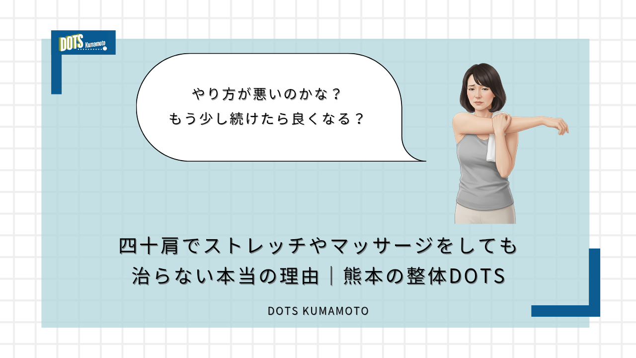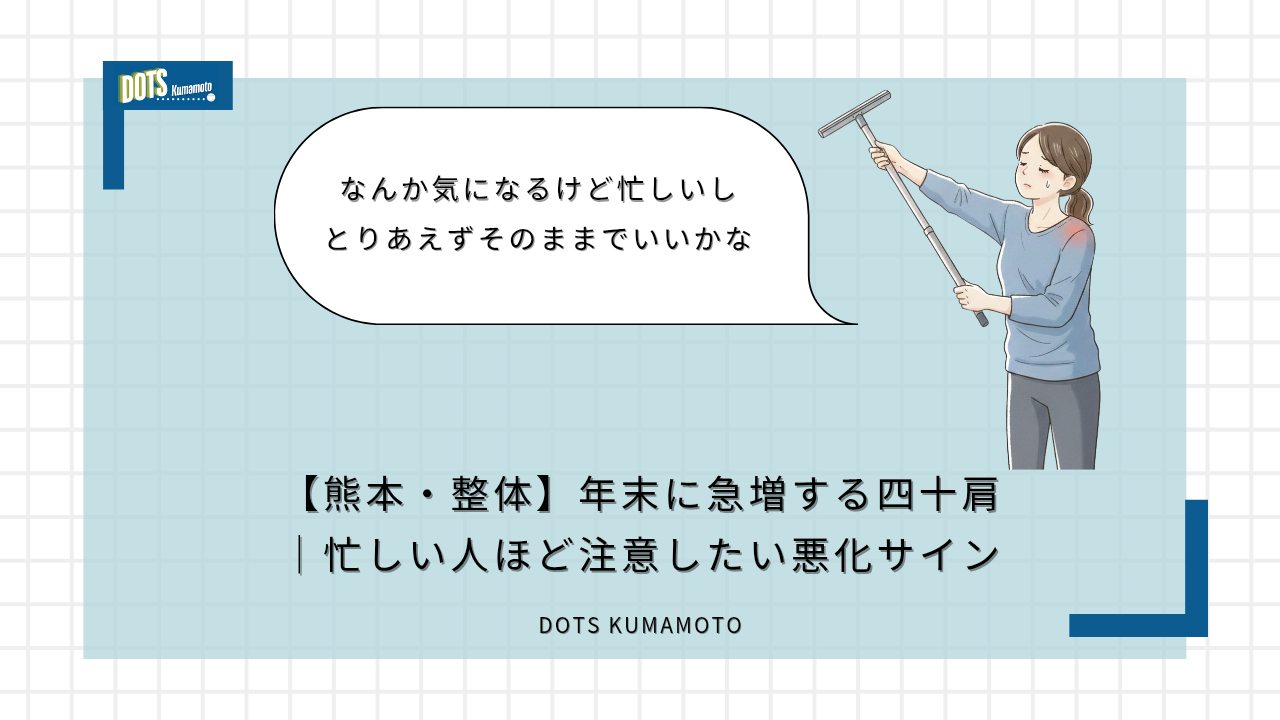 忙しい年末に悪化しやすい四十肩を放置するとどうなる?熊本の整体DOTSが、症状が進行する理由と早めにケアすべきサインを理学療法士の視点で分かりやすく解説。