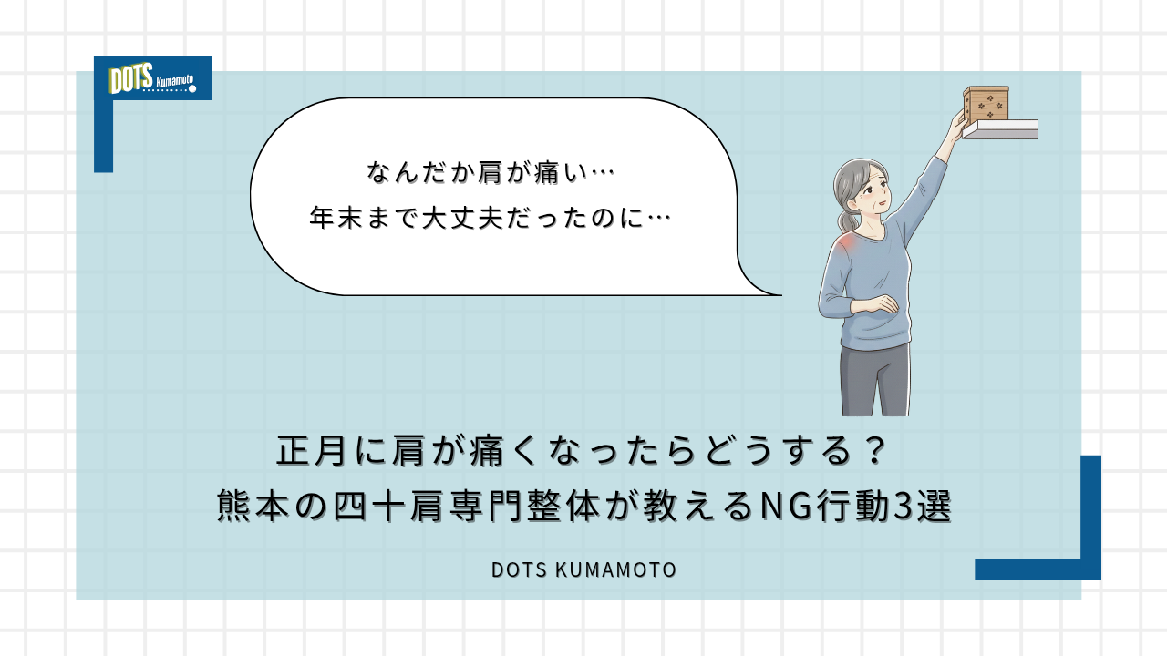 BLOG正月に肩が痛くなった、腕が上がらない…それ四十肩かもしれません。熊本の四十肩専門整体が、正月に悪化しやすい理由と絶対にやってはいけないNG行動3選を理学療法士が分かりやすく解説。