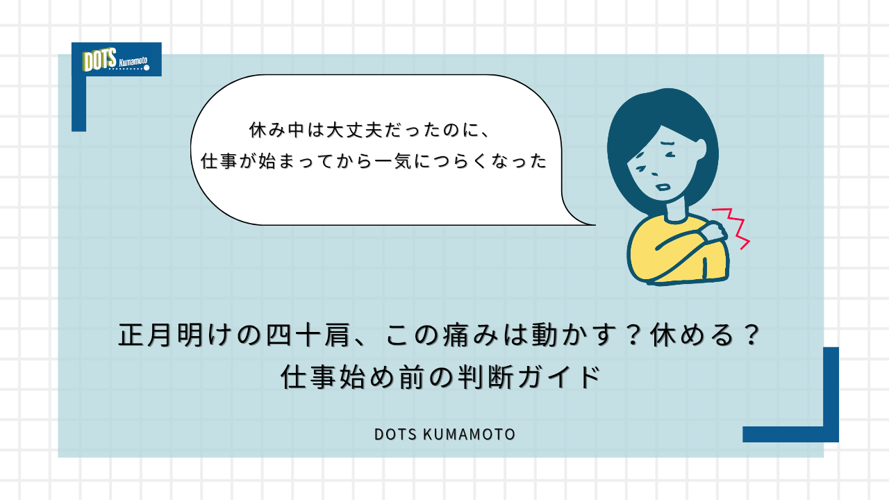 BLOG正月明けに四十肩が悪化して不安な方へ。仕事始め前にやるべき正しい対処法を、熊本の理学療法士が分かりやすく解説。今が炎症期か回復期かの見極めと、やってはいけない行動も紹介。