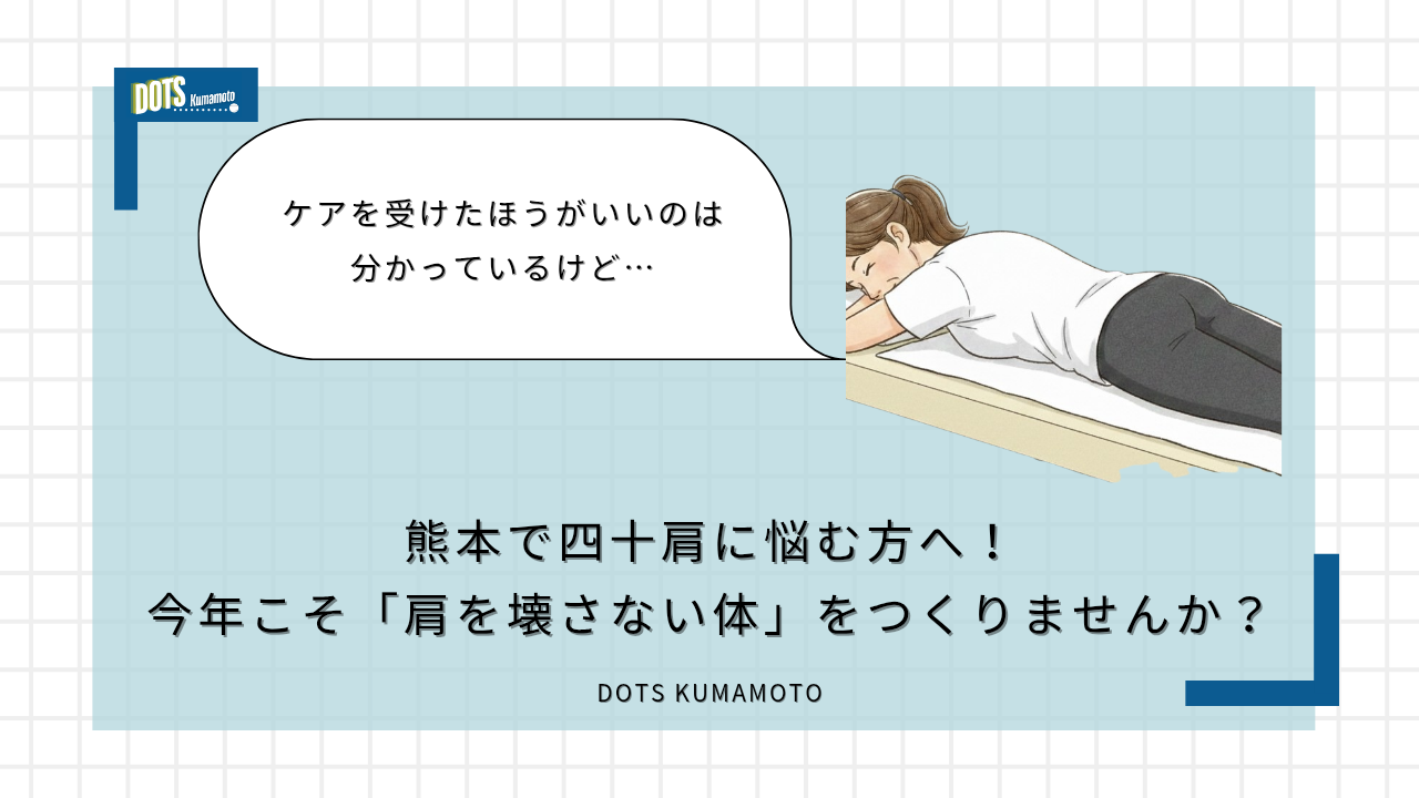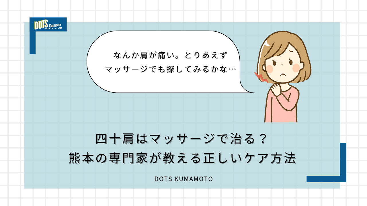 BLOG熊本で四十肩に悩む方へ。整体DOTSが「自然に治る?」「動かした方がいい?」など、四十肩のよくある質問に理学療法士が分かりやすく回答。痛みを長引かせない正しい対処法と改善の考え方をまとめました。