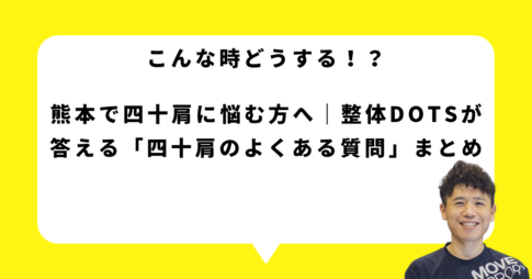 熊本で四十肩に悩む方へ。整体DOTSが「自然に治る?」「動かした方がいい?」など、四十肩のよくある質問に理学療法士が分かりやすく回答。痛みを長引かせない正しい対処法と改善の考え方をまとめました。