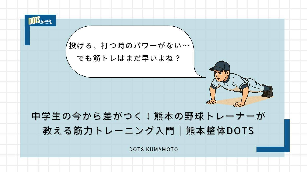 BLOG中学生の野球選手に必要な「自重→ウエイトトレーニング」への正しいステップアップを解説。熊本DOTSが理学療法士の視点から、成長期に筋力を安全に高める方法を紹介します。