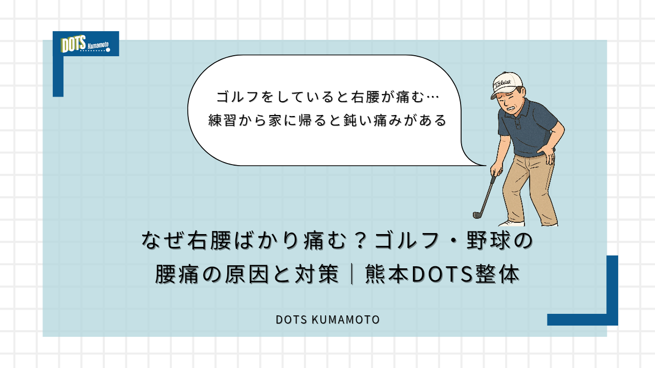 この記事では、ゴルフや野球でなぜ右腰に痛みが出やすいのか、その原因と対策を解説しました!!ゴルフや野球で右腰痛が多いのは「競技特性上、右側に負担が集まりやすい」ことが大きな理由です。しかし実際には、左腰が痛む人、腰全体に痛みが広がる人も少なくありません。大切なのは右であろうと左であろうと、体の使い方や機能を見極め、日頃から正しい整備を行うことです!DOTSでは、その場しのぎの対応ではなく、痛みを解決し、再発を防ぐための体づくりまでサポートしています。もう二度と腰痛で悩みたくないという方はぜひ一度ご相談ください!